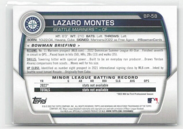 You are purchasing a 2023 Bowman 1st Edition Lázaro Montes #BPPF-58. You will receive the exact item in the photographs. Thank you for looking.