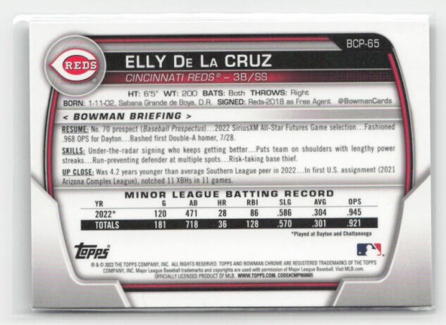 You are purchasing a 2023 Bowman Elly De La Cruz #BCP-65 Chrome Prospects. You will receive the exact item in the photographs. Thank you for looking.