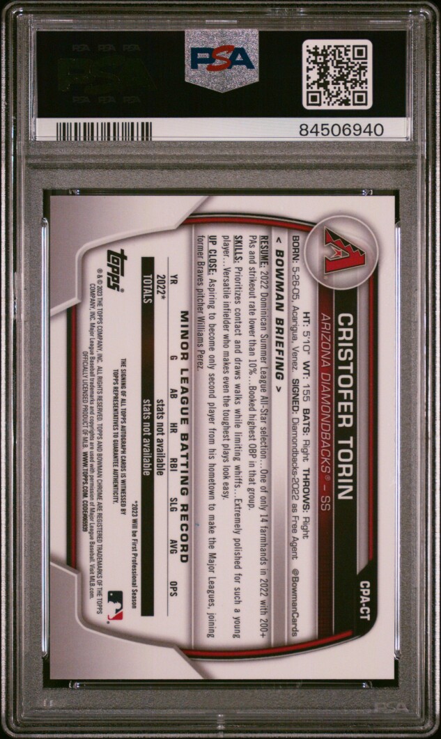 You are purchasing a 2023 Bowman Chrome Prospect Autographs Cristofer Torin #CPACT PSA 10. You will receive the exact item in the photographs. Thank you for looking.
