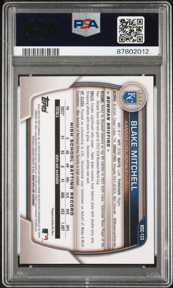 You are purchasing a { 2023 Bowman Draft Blake Mitchell #BDC133 Chrome PSA 9. You will receive the exact item in the photographs. Thank you for looking.