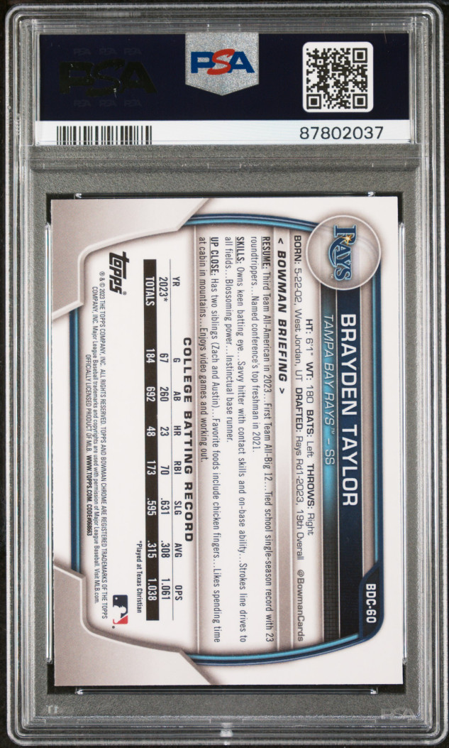 You are purchasing a { 2023 Bowman Draft Brayden Taylor #BDC60 Chrome PSA 10. You will receive the exact item in the photographs. Thank you for looking.