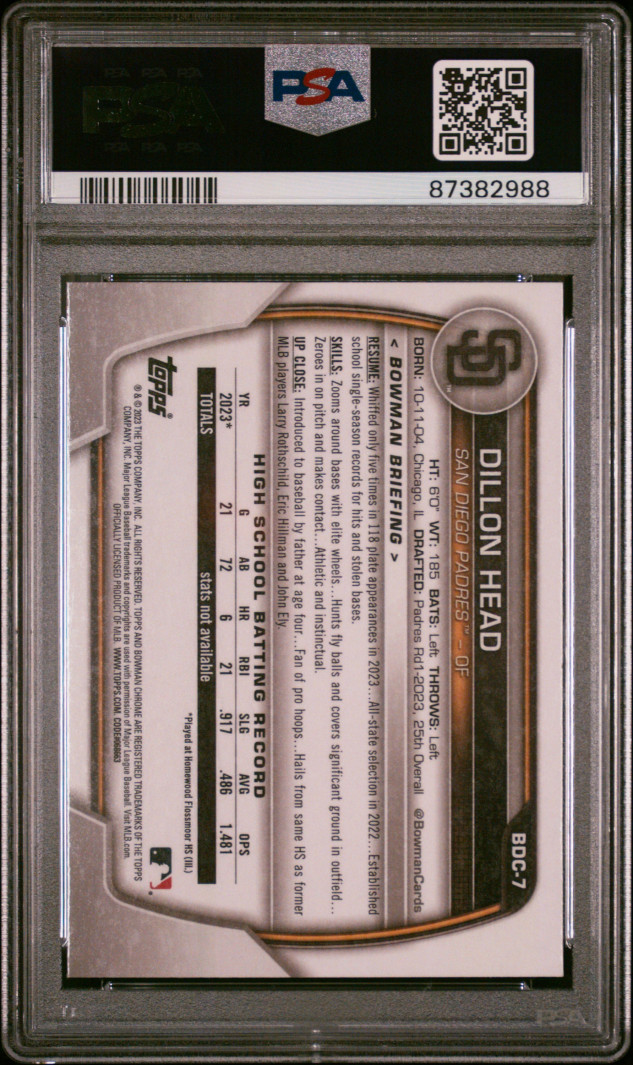 You are purchasing a { 2023 Bowman Draft Dillon Head #BDC7 Chrome PSA 9. You will receive the exact item in the photographs. Thank you for looking.