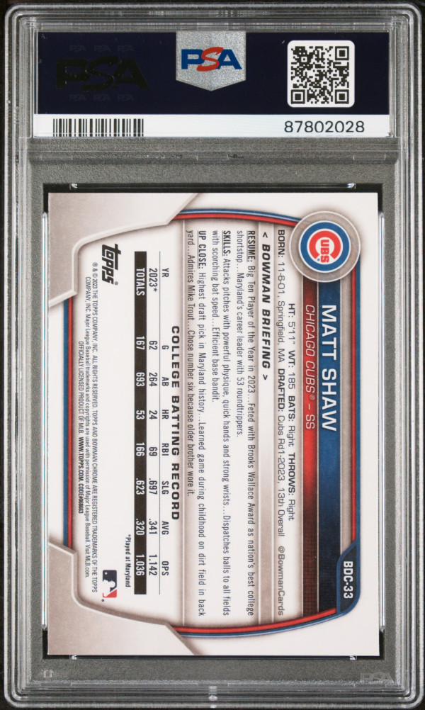 You are purchasing a { 2023 Bowman Draft Matt Shaw #BDC33 Chrome PSA 9. You will receive the exact item in the photographs. Thank you for looking.