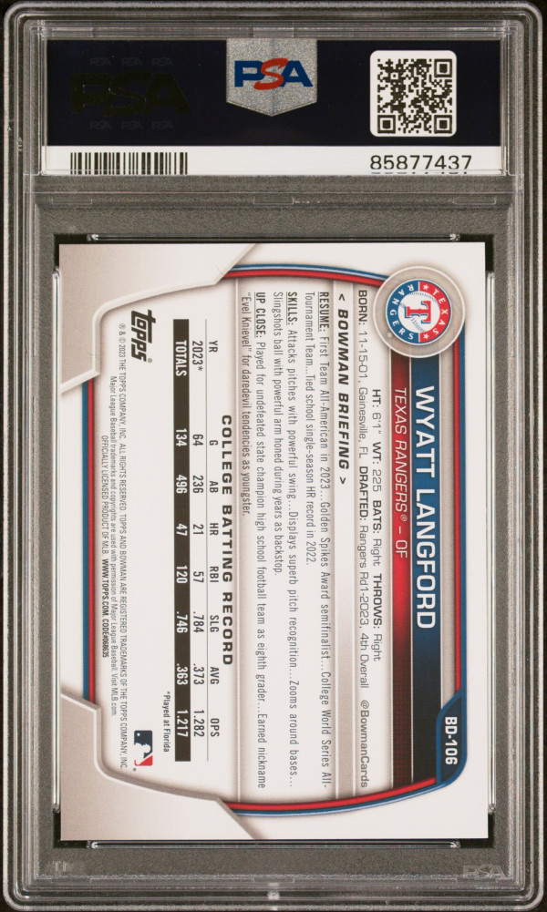 You are purchasing a { 2023 Bowman Draft Wyatt Langford #BD106 PSA 10. You will receive the exact item in the photographs. Thank you for looking.