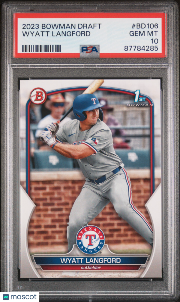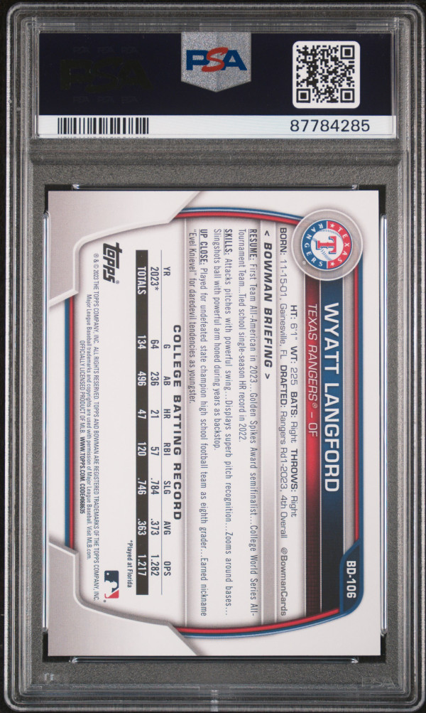 You are purchasing a { 2023 Bowman Draft Wyatt Langford #BD106 PSA 10. You will receive the exact item in the photographs. Thank you for looking.