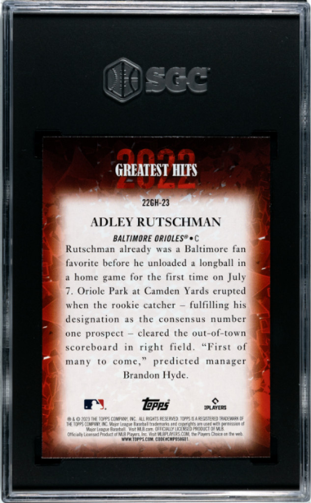 Secure the perfect "buy-low" investment for your Baltimore collection with this 2023 Topps 2022 Greatest Hits Adley Rutschman #22GH-23, flawlessly graded SGC 10 Gem Mint. This stunning foilboard insert commemorates a major offensive milestone from his debut year, specifically his historic performance on July 7th, 2022. While Rutschman is coming off a challenging 2025 season, the Orioles have doubled down on him as their franchise cornerstone for 2026, making him a premier candidate for a massive All-Star rebound. Grab this pristine, top-grade rookie-era insert now before his stock surges back to elite levels this