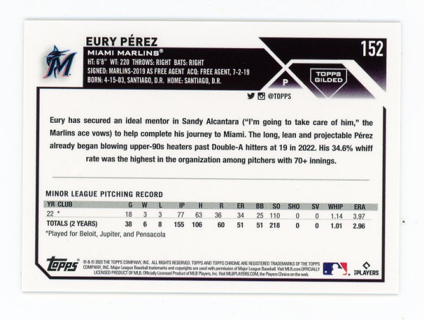 2023 Topps Chrome Gilded EURY PEREZ Rookie RC GOLD REFRACTOR #/199 Miami Marlins