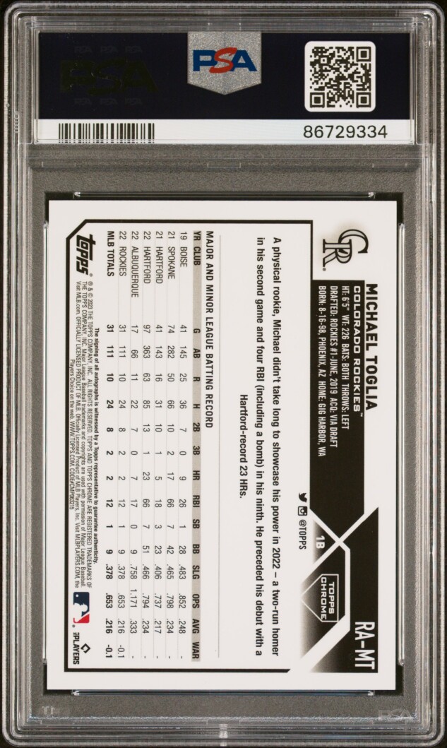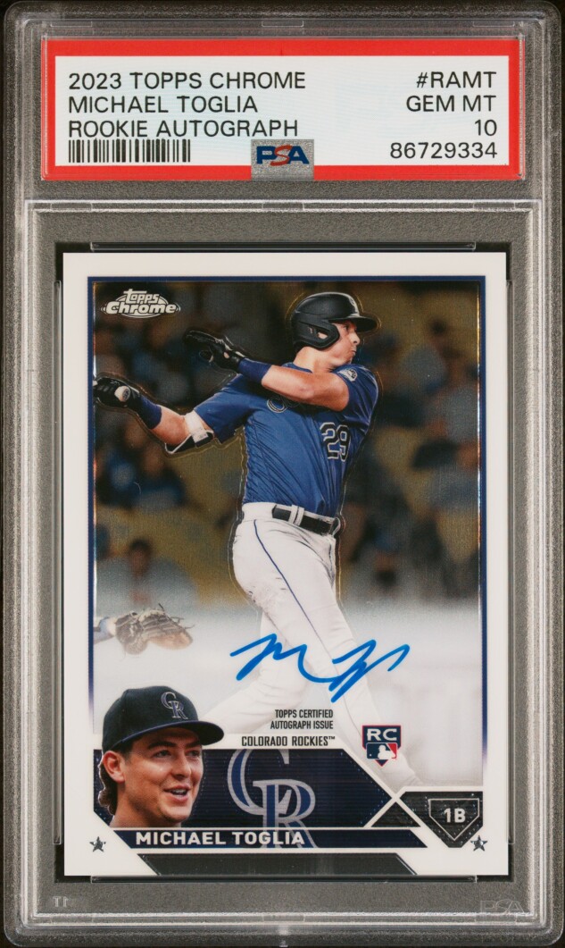 The product is a 2023 Topps Chrome Michael Toglia Rookie Auto trading card graded as a PSA 10 GEM MINT. This card features an autograph from Michael Toglia of the Colorado Rockies, making it a highly sought-after collectible for baseball fans and card collectors. Graded by Professional Sports Authenticator (PSA), this card is part of the Rookie Autographs insert set within the Topps Chrome series, making it a valuable addition to any sports trading card collection.