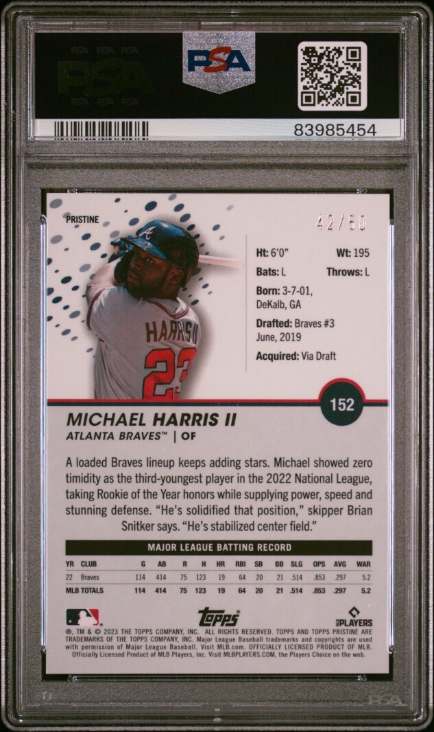 You are purchasing a 2023 Topps Pristine Michael Harris II #152 Gold /50 RC GEM MINT PSA 10. Thank you for looking.