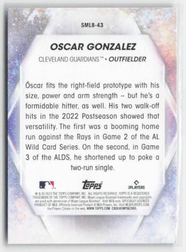 You are purchasing a 2023 Topps Oscar Gonzalez #SMLB-43 Stars of MLB. You will receive the exact item in the photographs. Thank you for looking.