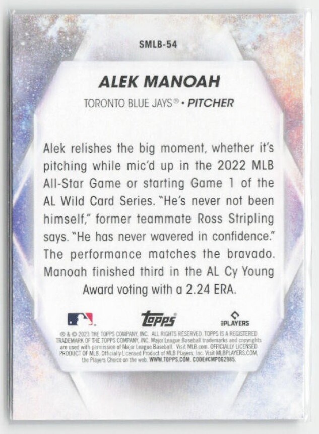 You are purchasing a 2023 Topps Alek Manoah #SMLB-54 Stars of MLB. You will receive the exact item in the photographs. Thank you for looking.