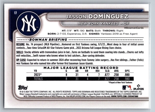 You are purchasing a 2024 Bowman Jasson Domínguez #17 RC. You will receive the exact item in the photographs. Thank you for looking.