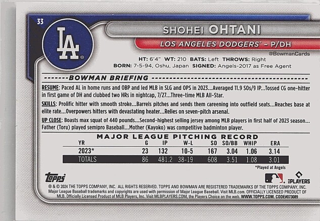 You are purchasing a 2024 Bowman Shohei Ohtani #33. You will receive the exact item in the photographs. Thank you for looking.