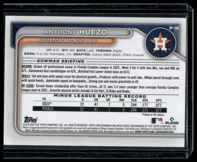 2024 Bowman Anthony Huezo #BP-108 Prospects Purple SN