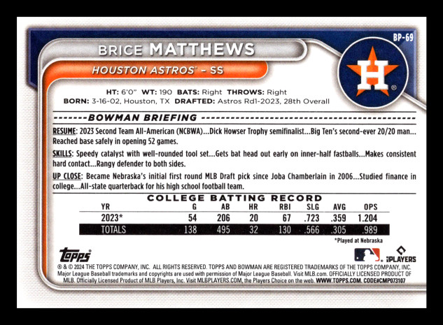 2024 Bowman Brice Matthews #BP-69 Houston Astros 1st Bowman