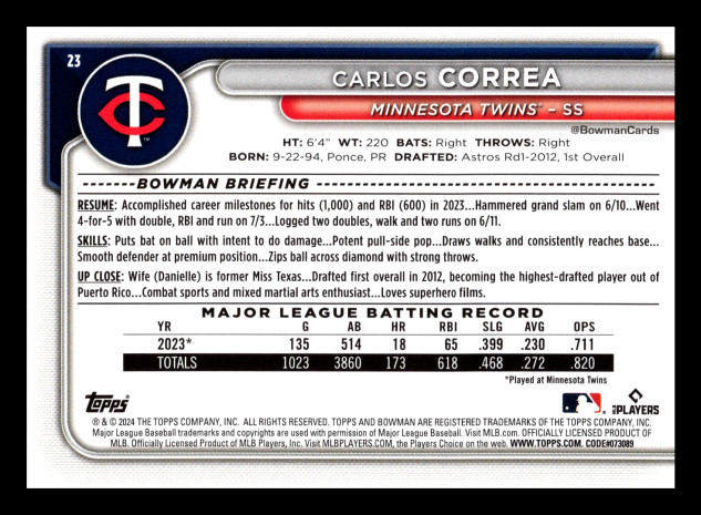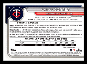 You are purchasing a 2024 Bowman Carlos Correa #23. You will receive the exact item in the photograph/scan. Thank you for looking.