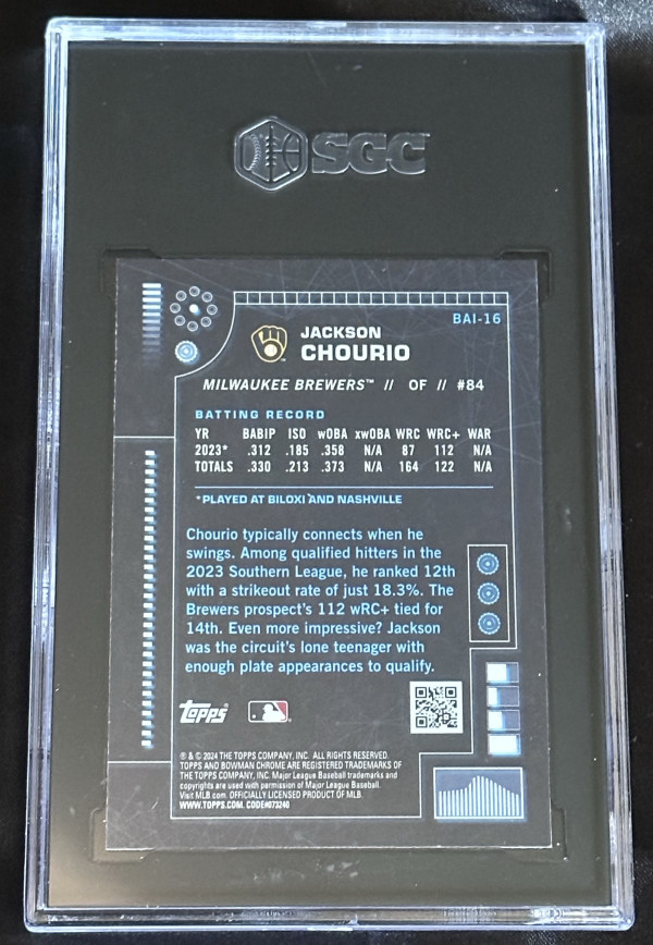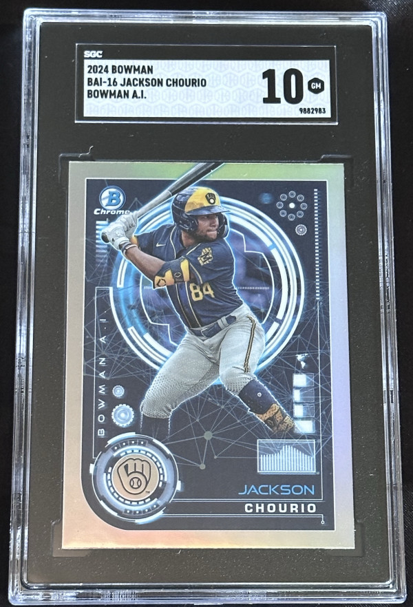 2024 Bowman Chrome ‘Bowman A.I.’ rookie card of Milwaukee Brewers Outfielder Jackson Chourio, card #BAI-16. Graded Gem Mint 10 by SGC