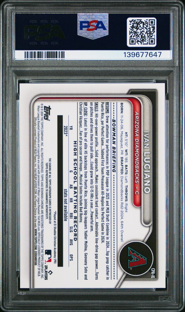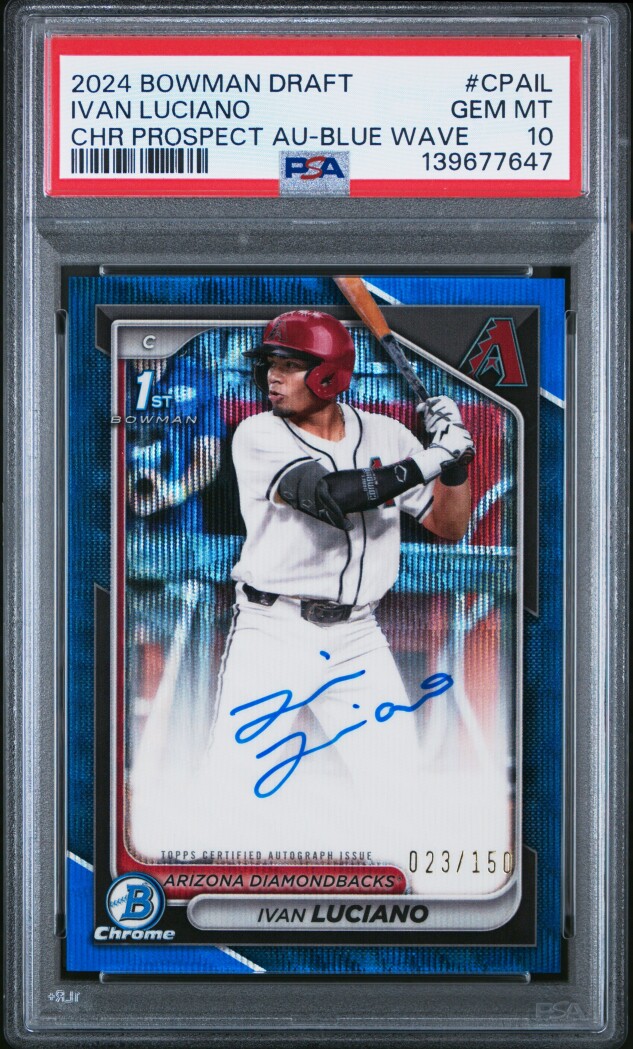 The product is a 2024 Bowman Chrome Blue Wave Ivan Luciano PROSPECT AUTO #CPAIL trading card, graded as a PSA 10 GEM Mint. This autographed card is part of the Chrome Prospect Autographs insert set, featuring a limited print run of 150. Manufactured by Topps, the card is from the Bowman Draft series and belongs to the Major League Baseball (MLB) league. It is a sought-after collectible for baseball fans and card collectors alike, showcasing a promising rookie player from the Arizona Diamondbacks team.