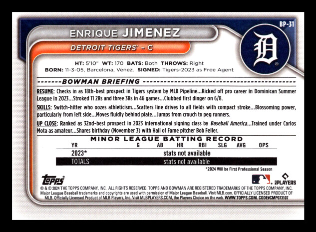 2024 Bowman Enrique Jimenez #BP-31 Detroit Tigers 1st Bowman