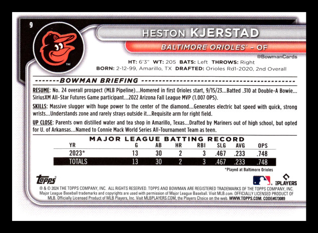 You are purchasing a 2024 Bowman Heston Kjerstad #9. You will receive the exact item in the photograph/scan. Thank you for looking.