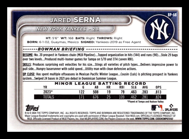 2024 Bowman Jared Serna #BP-68 New York Yankees 1st Bowman