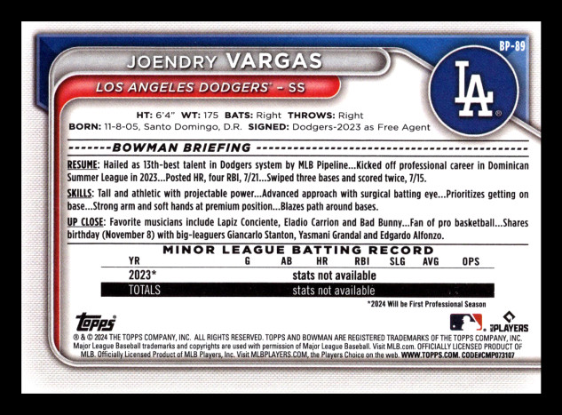 You are purchasing a 2024 Bowman Joendry Vargas #BP-89. You will receive the exact item in the photograph/scan. Thank you for looking.