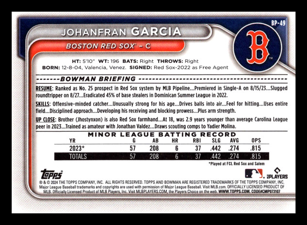 You are purchasing a 2024 Bowman Johanfran Garcia #BP-49 1st Bowman. You will receive the exact item in the photograph/scan. Thank you for looking.