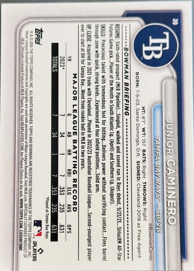 Up for sale is a 2024 Bowman Junior Caminero Rookie Card featuring one of the Tampa Bay Rays’ top young hitters.