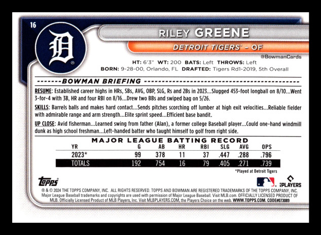 You are purchasing a 2024 Bowman Riley Greene #16. You will receive the exact item in the photograph/scan. Thank you for looking.