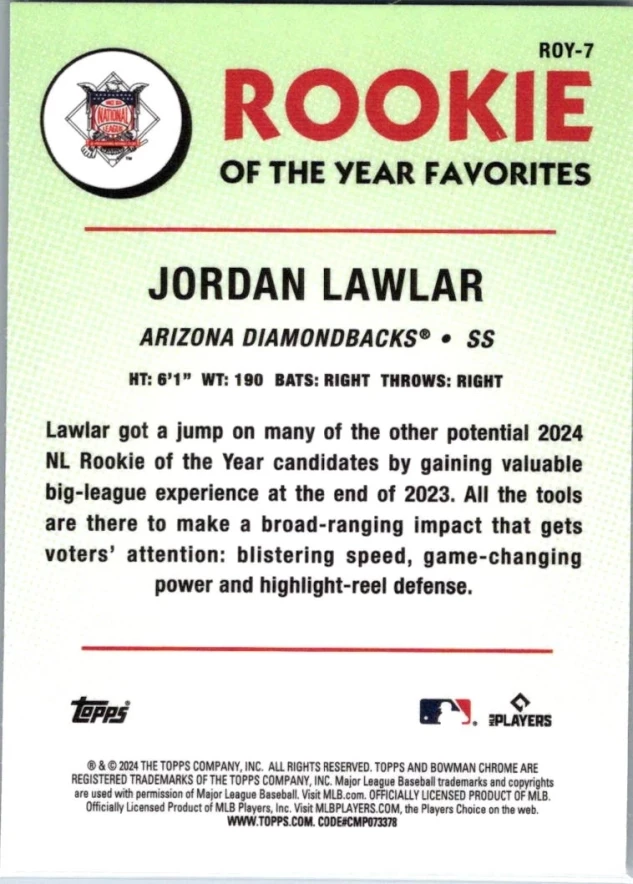 This is a nice example of a 2024 Bowman #ROY-7 Jordan Lawlar Rookie of the Year Favorites Mojo Refractors