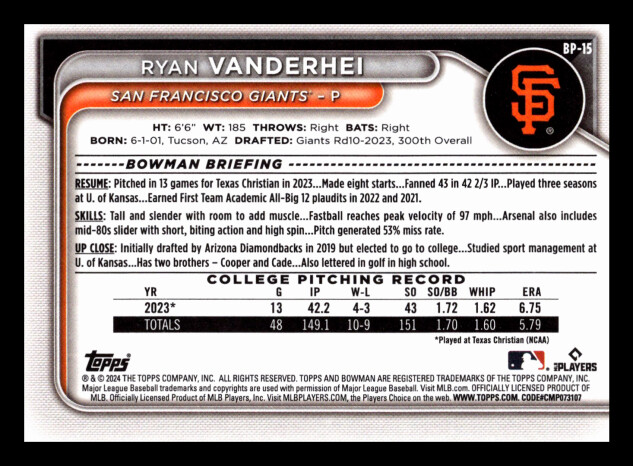 You are purchasing a 2024 Bowman Ryan Vanderhei #BP-15. You will receive the exact item in the photograph/scan. Thank you for looking.