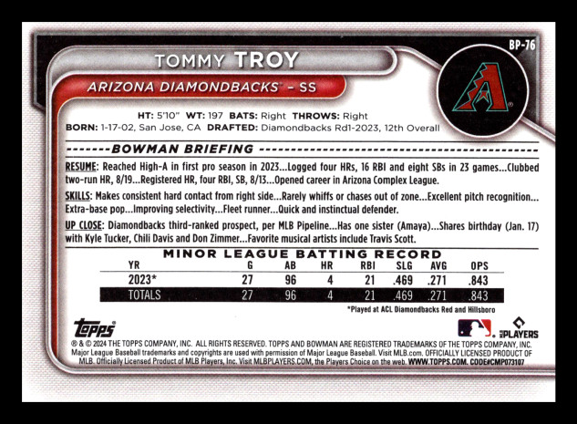 You are purchasing a 2024 Bowman Tommy Troy #BP-76. You will receive the exact item in the photograph/scan. Thank you for looking.