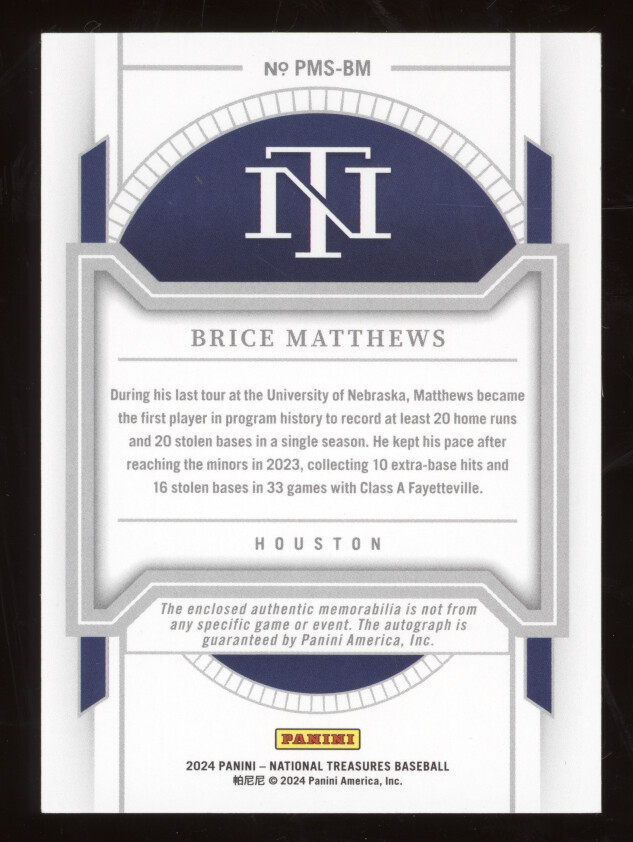 You are purchasing a 2024 Panini National Treasures Brice Matthews #PMS-BM Patch Autograph 05/49. You will receive the exact item in the photographs. Thank you for looking.