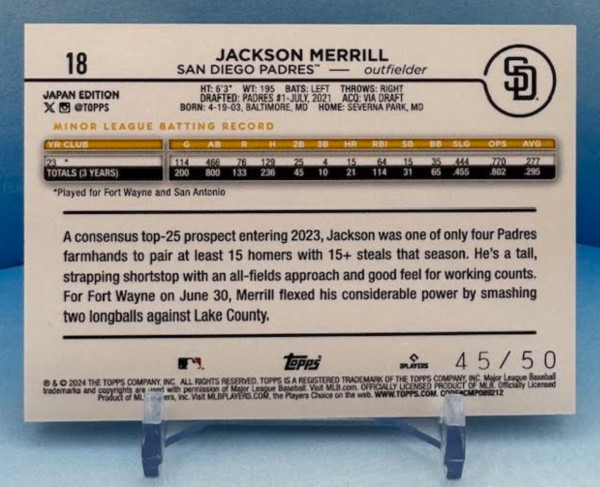 2024 RARE Topps Baseball Japan Edition Jackson Merrill #18 Purple /50 Rookie RC