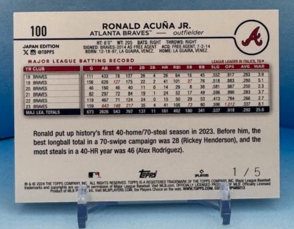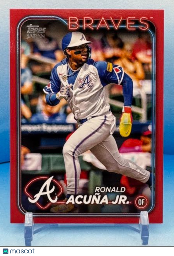 You are purchasing a 2024 Topps Ronald Acuña Jr. #100 Red Short Print Topps. You will receive the exact item in the photographs. Thank you for looking.