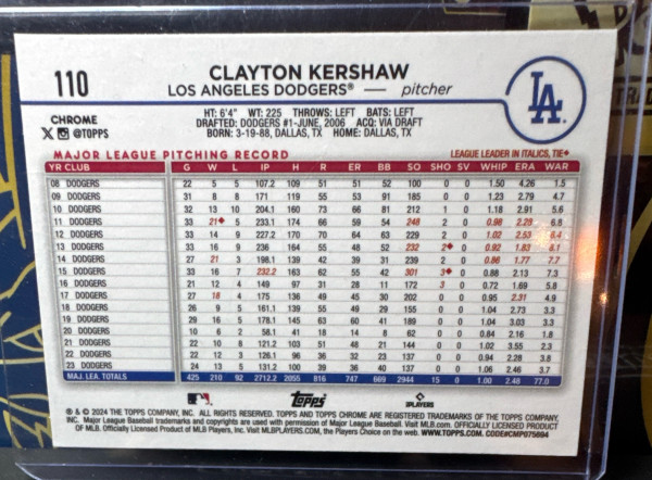 2024 Topps Chrome #110 Clayton Kershaw Raywave Refractor Los Angeles Dodgers