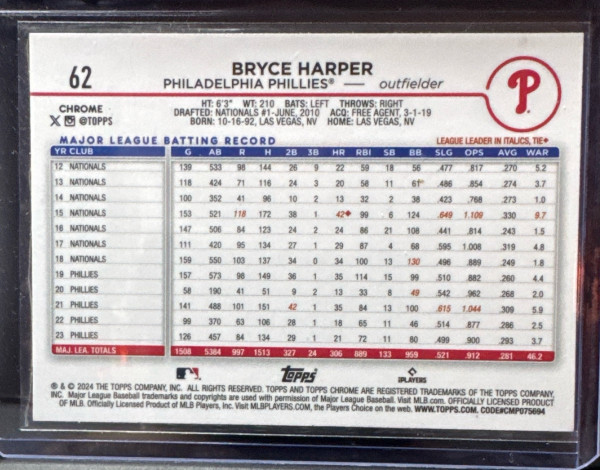 2024 Topps Chrome #62 Bryce Harper Xfractor Refractor Philadelphia Phillies