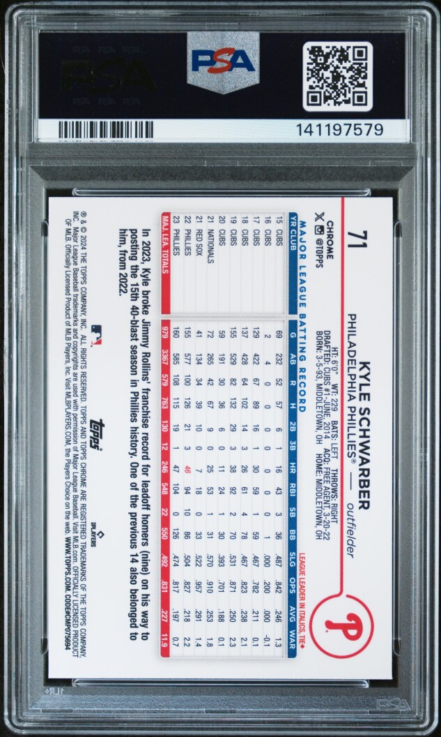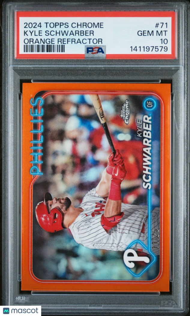 You are purchasing a 2024 Topps Chrome Kyle Schwarber Orange Refractor PSA 10. You will receive the exact item in the photographs. Thank you for looking.