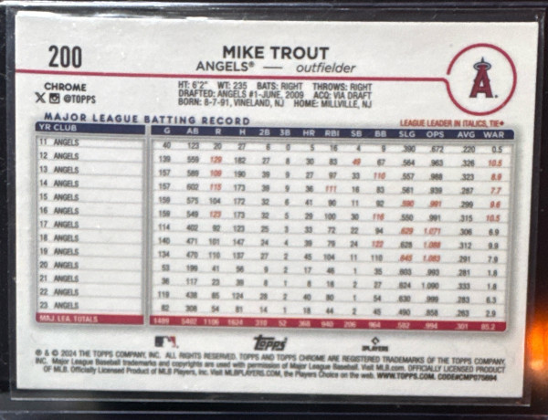 2024 Topps Chrome MIKE TROUT Raywave Refractor #200 Card LA ANGELS Insert SP MVP