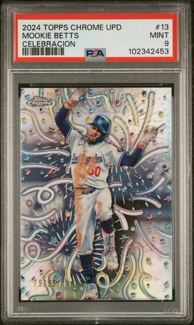 The product is a 2024 Topps Chrome Update Series SSP trading card featuring Mookie Betts of the Los Angeles Dodgers. This specific card is from the Celebración insert set. It is a standard-sized sports trading card made of card stock, and is an insert. This collectible item celebrates the Dodgers player in a unique and special way, making it a valuable addition for any baseball card collector.