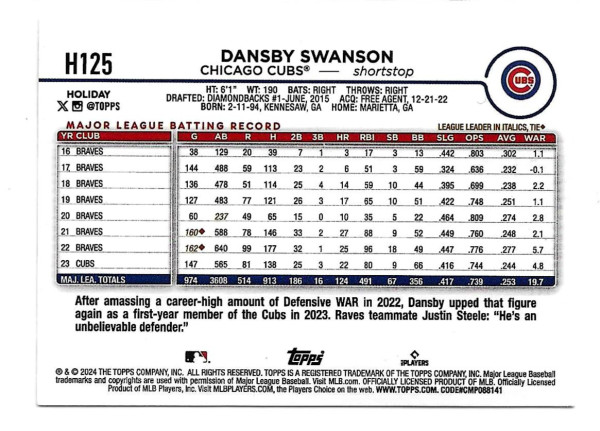 2024 TOPPS HOLIDAY METALLIC TREE #H125 DANSBY SWANSON