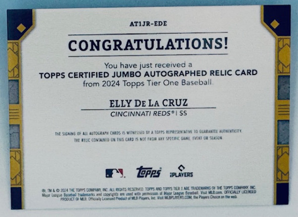 2024 Topps Tier 1 Elly De La Cruz Certified Jumbo Relic Auto /25 RC $$$