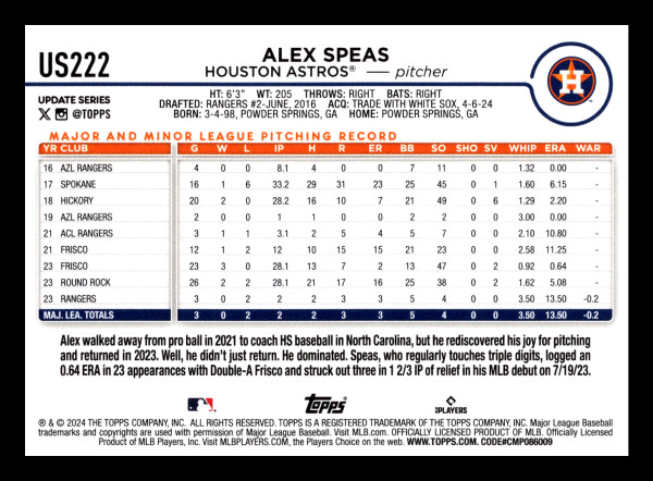 You are purchasing a 2024 Topps Update Series Alex Speas #US222 RC. You will receive the exact item in the photograph/scan. Thank you for looking.