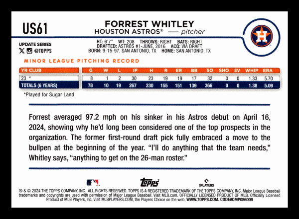 You are purchasing a 2024 Topps Update Series Forrest Whitley #US61 RC. You will receive the exact item in the photograph/scan. Thank you for looking.