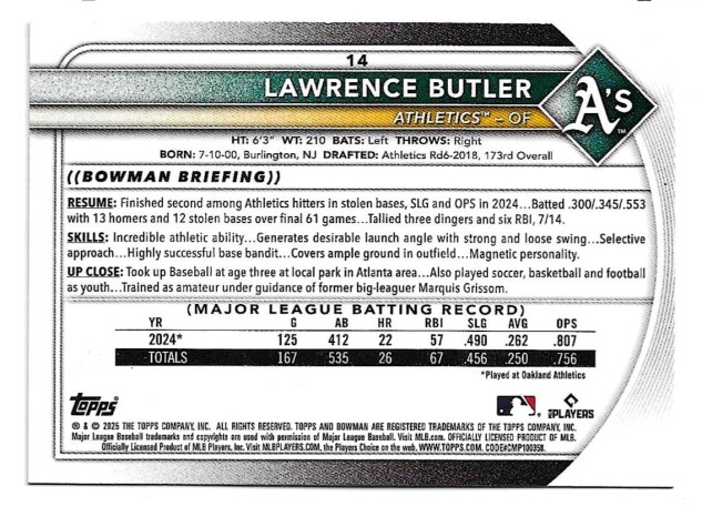 2025 Bowman #14 Lawrence Butler - Oakland Athletics