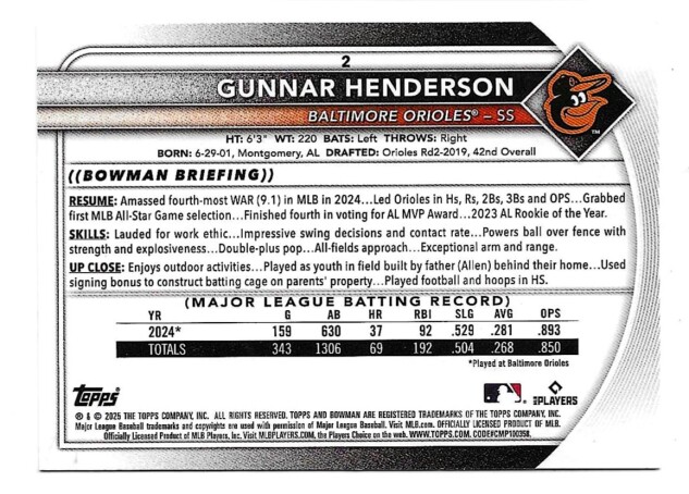 2025 Bowman #2 Gunnar Henderson - Baltimore Orioles