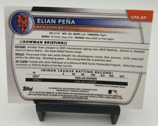You are looking at the 2025 Bowman Chrome 1st Bowman Autograph of Elian Peña, card number #CPA-EP, shortstop for the New York Mets. This is a Topps Certified Autograph Issue — signed directly and witnessed by Topps representatives, guaranteeing 100% authenticity.