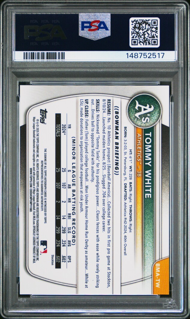 You are purchasing a 2025 Bowman Chrome Tommy White #TW Green Ref Auto /99 PSA 9. Thank you for looking.