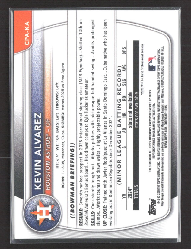 You are purchasing a 2025 Bowman Chrome Kevin Alvarez #CPA-KA Gold Refractor 05/69 1st Bowman. You will receive the exact item in the photographs. Thank you for looking.