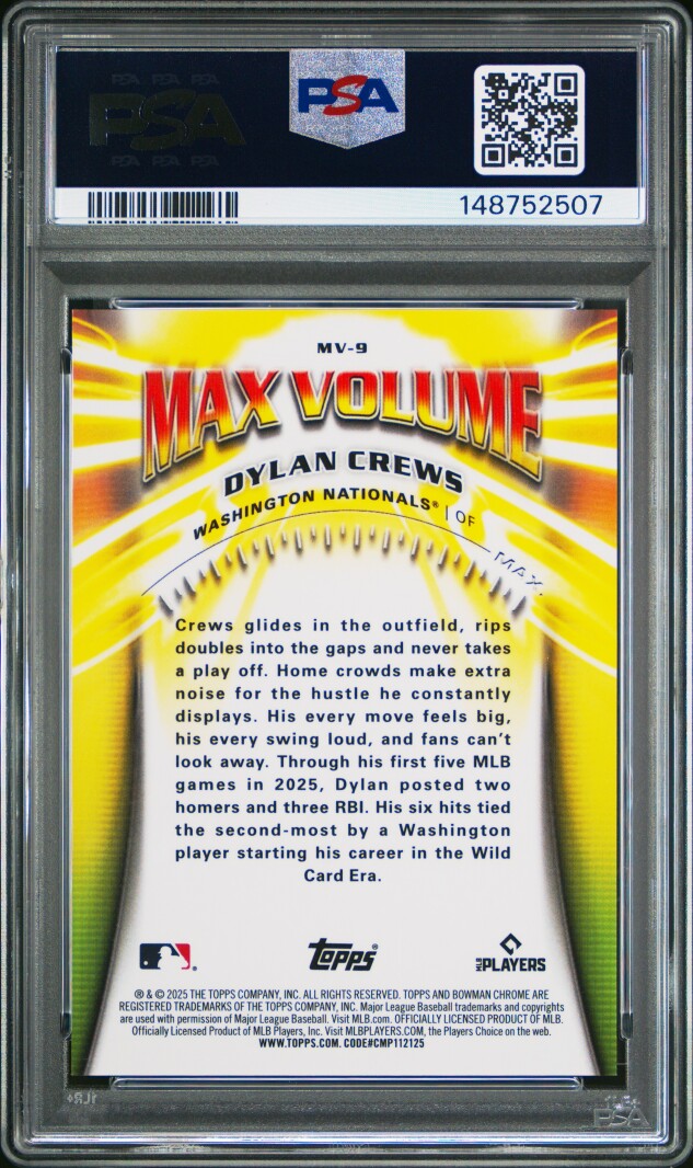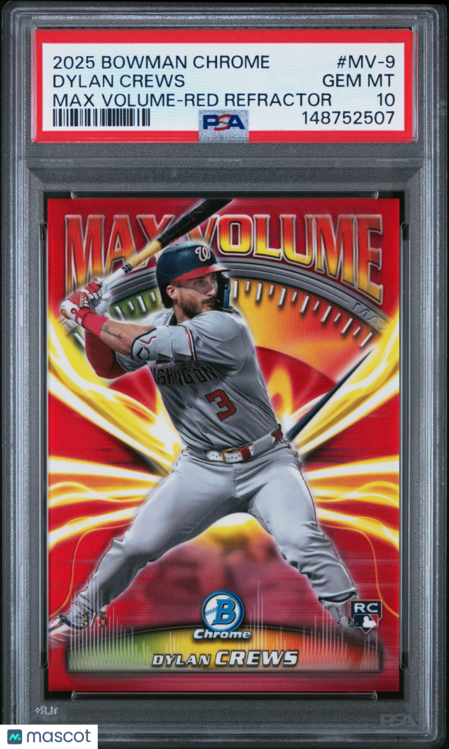 You are purchasing a 2025 Bowman Chrome Max Volume Dylan Crews #MV-9 Red Refractor /5 PSA 10. Thank you for looking.